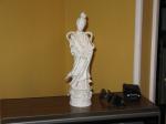 This is a blanc de chine piece sold by Homco (Home Interiors, a.k.a., Homco Gifts, a Chinese company) of Guanyin (also spelt Quan Yin/Kuan Yin/Kwan Yin), the Buddhist goddess (Bodhisattva) of compassion and mercy. (In Vietnam, she is Quan'Am; in Japan, Kannon; in Bali, Kanin.) Homco buys its wares from potteries all over the East, but it is most likely made in China or Japan.