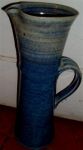 Sixteen inches tall, this studio stoneware pitcher is glazed in blues and has an unidentified signature on the bottom. I hope someone can help recognize the signature....or even whether it looks American or European....that would help.