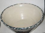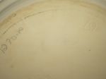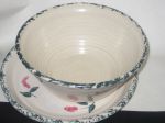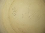 Stoneware Bowl/Plate matching set. Blue Sponge on rim and peach flower on sides. The Bowl is also made of coil rings. On bottom is the mark along with penciled letters/numbers. To me, looks like letter D with letter K sharing the beginning stroke. Anyone?